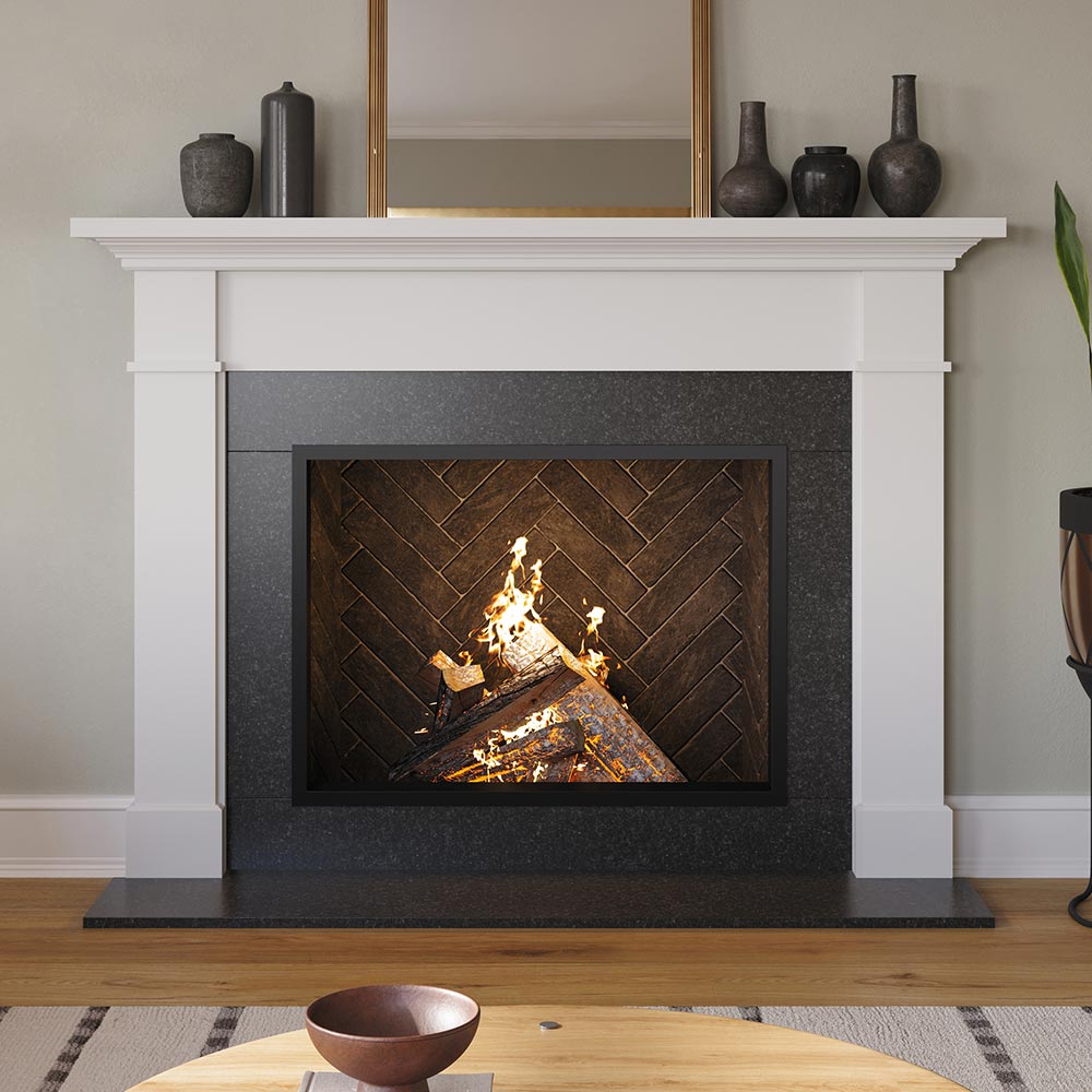 What's included — Full fireplace surround made in the USA from Poplar or Red Oak — built without shortcuts, showing in the joinery, the finish, and the way it holds the wall